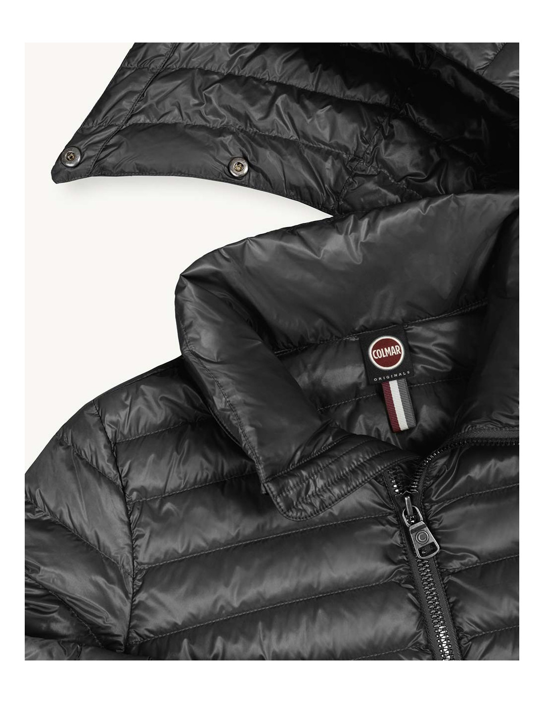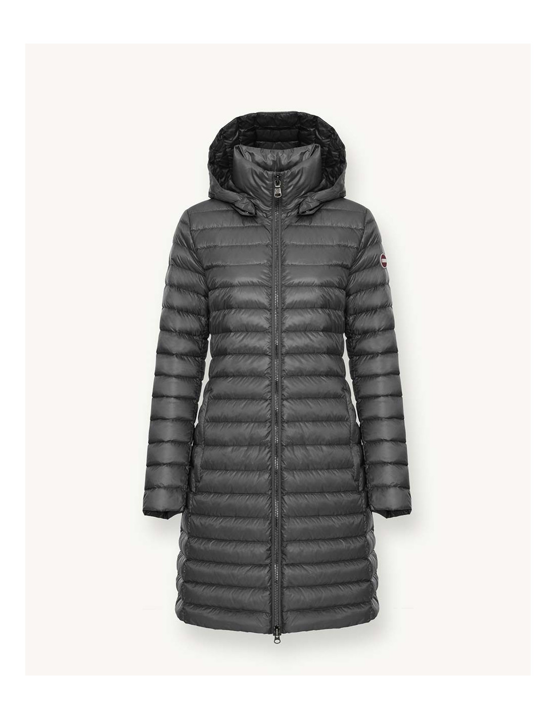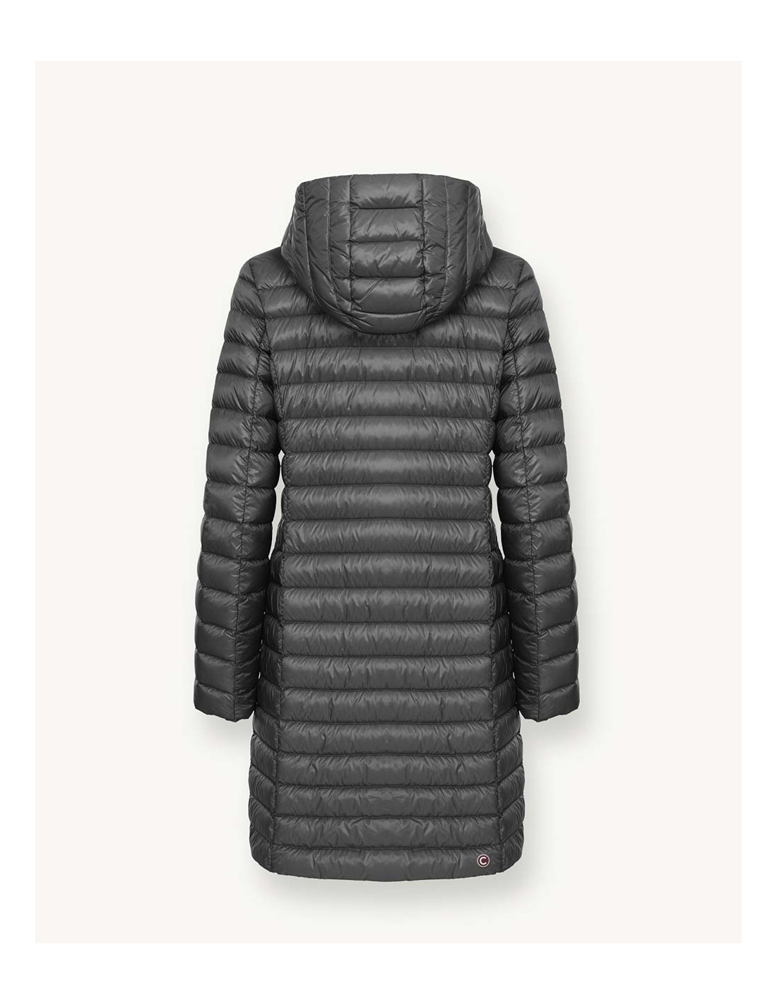 Mittellange Damenjacke mit abnehmbarer Kapuze aus recyceltem Polyamidgewebe, gemischt mit schwarz gefärbtem Garn, um dunkle Farben zu erhalten, die eine sehr tiefe Farbpalette ergeben. Wasserabweisende Behandlung. Gesteppt mit natürlichen Daunen, leicht. Die Bettdecken sind durchgehend regelmäßig und die Passform ist normal. Bequeme und praktische Seitentaschen. Mit dem Colmar-Aufnäher auf dem linken Ärmel und dem „C“-Aufnäher auf der rechten Rückseite können Sie die Jacke individuell mit dem Markenlogo des Unternehmens versehen.